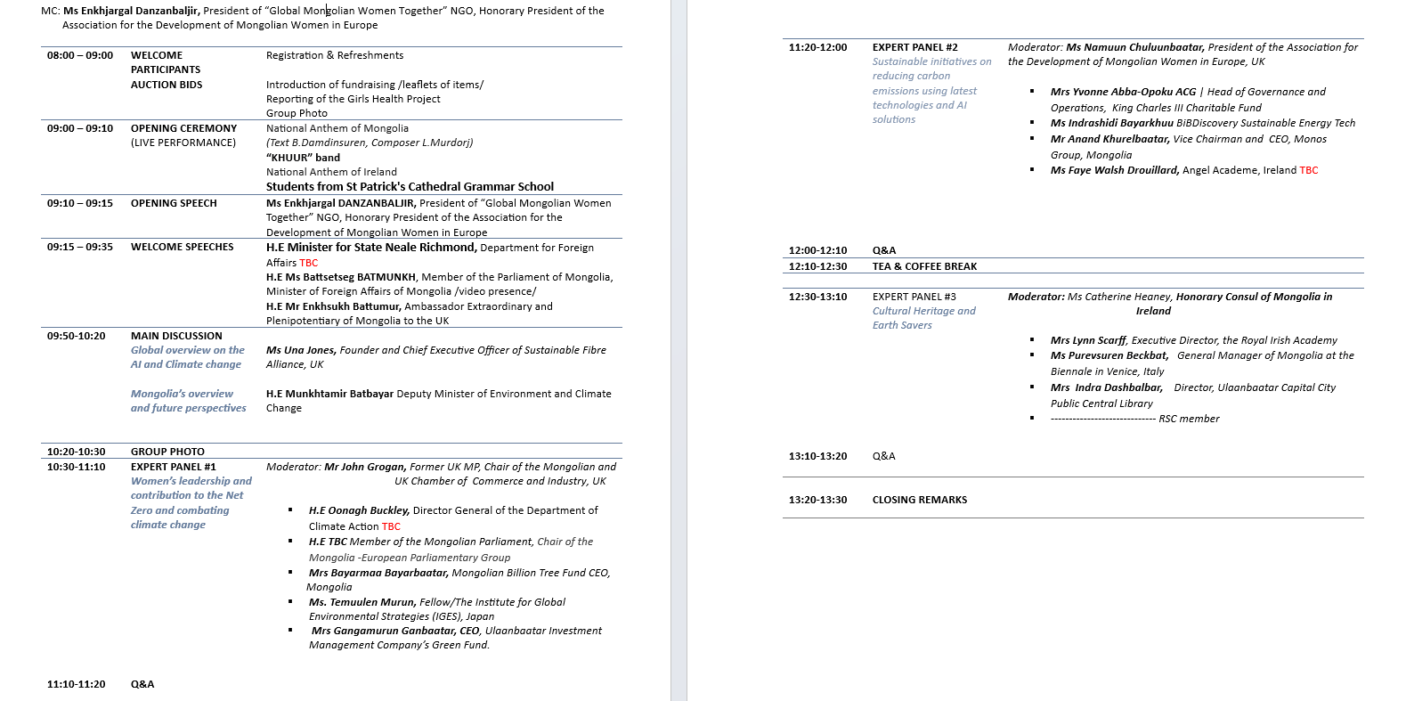 The International Forum will highlight the importance of empowering women in addressing climate change and achieving a net zero future, while also recognizing cultural heritage as Earth stewards. This event aims to bring together policymakers, scientists, civil society representatives, indigenous communities, and private sector stakeholders in an inclusive environment conducive to innovation, learning, and collaborative problem-solving. Since the forum intends to discuss the implementation of the net zero programs and combating climate change, strengthening the innovation ecosystem, the organizers wish to welcome the Irish and Mongolian business people, as well as representatives of the European Union and other countries working in the green-tech-economy to join in consultations and discussions on gender equality in environmental initiatives and the importance of women's leadership in the transition to a net zero future, while recognizing and preserving cultural heritage as Earth stewards.